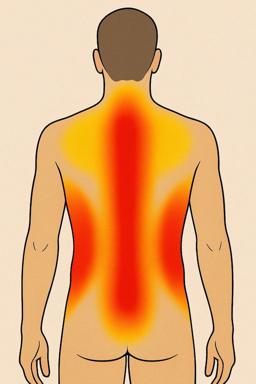 Keskiselkä on yleensä suhteellisen kivuton tai kohtalainen, mutta selkäranka ja lapaluut voivat tuntua terävästi.